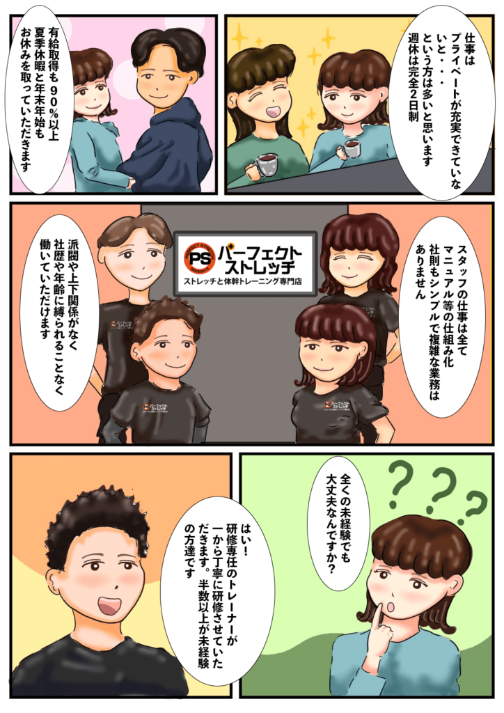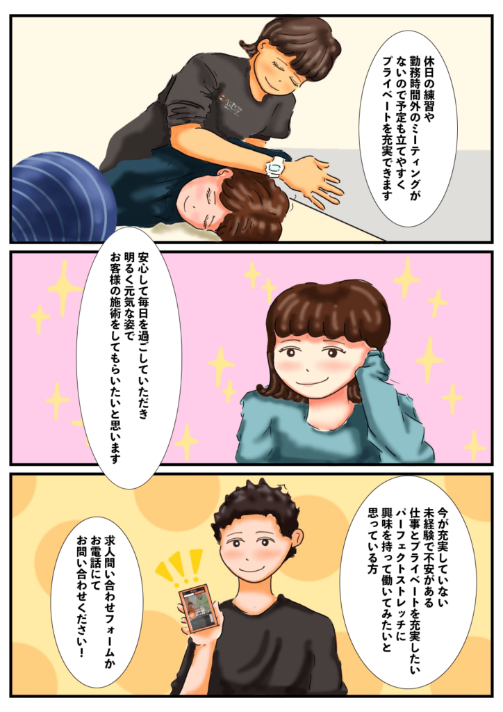 パーフェクトストレッチはすごく活気があり、職場内から元気が溢れています。私は業界未経験ですがしっかりとした研修制度があり、今ではトレーナーとして日々お客様にサービスを提供しています!新しいチャレンジがしたい。スポーツに関わる仕事がしたい。だけど未経験だからと不安になっている方。ぜひパーフェクトストレッチで一緒に成長しませんか?皆様と働けることを楽しみにしています!!